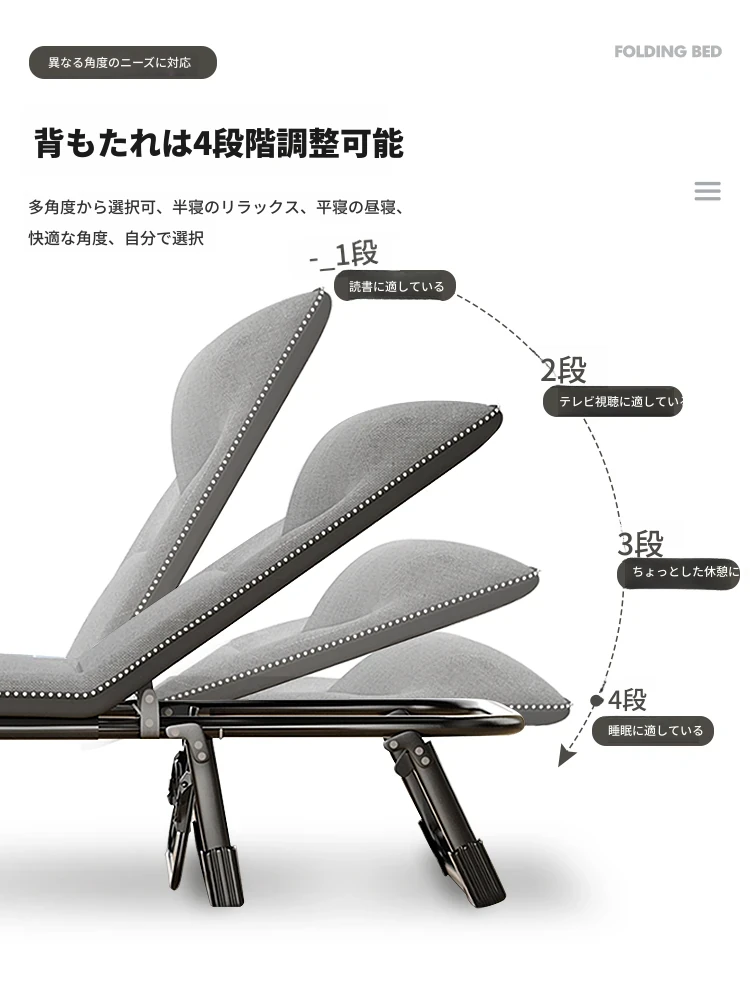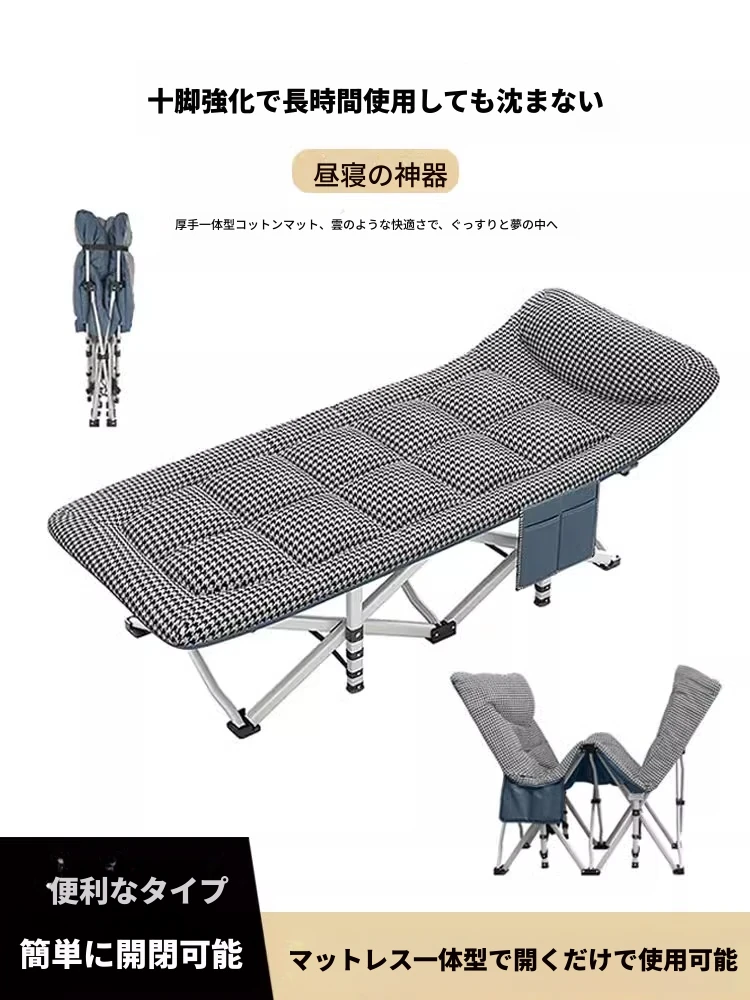 大人のためのオフィス用折りたたみベッド!シングルサイズのリクライニングチェアで、簡単に持ち運び可能。病院の付き添いや行軍中の昼寝にも最適!快適な休息を提供する便利なアイテムです。